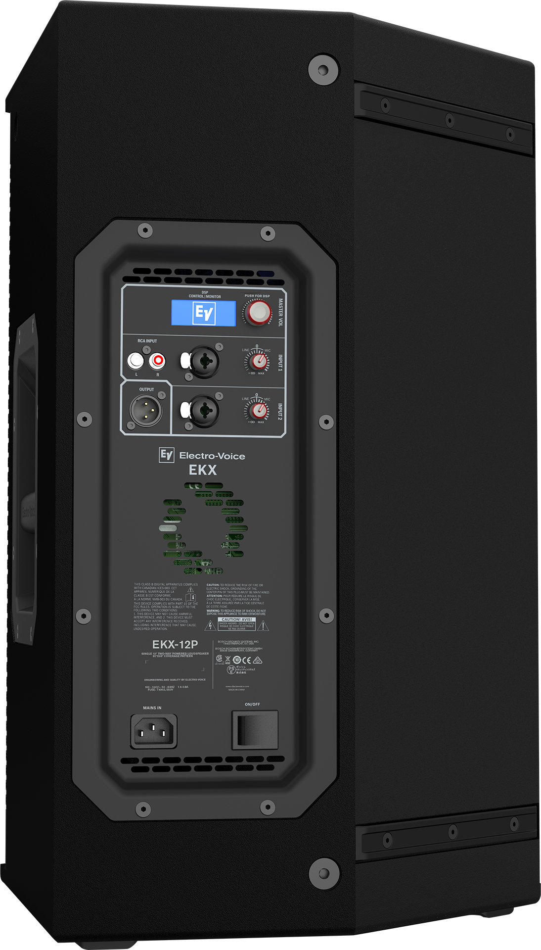 - High-efficiency 1500 W Class D power amplifier delivers up to 132 dB peak SPL on the EKX-12P via high-sensitivity transducers designed and engineered by EV.
